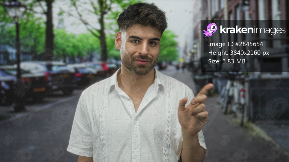 Young man pointing finger to chest on a narrow street flanked by parked cars, brick building facades and trees; doubt.