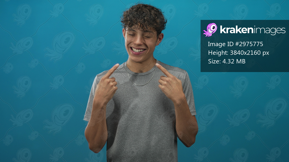 Young man pointing fingers at his teeth and smiling broadly in blue studio backdrop; joy youth energy.