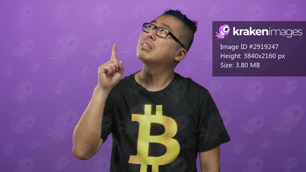 Young man pointing index finger upward while wearing black t shirt with large gold bitcoin symbol and glasses in a purple studio; thoughtful.