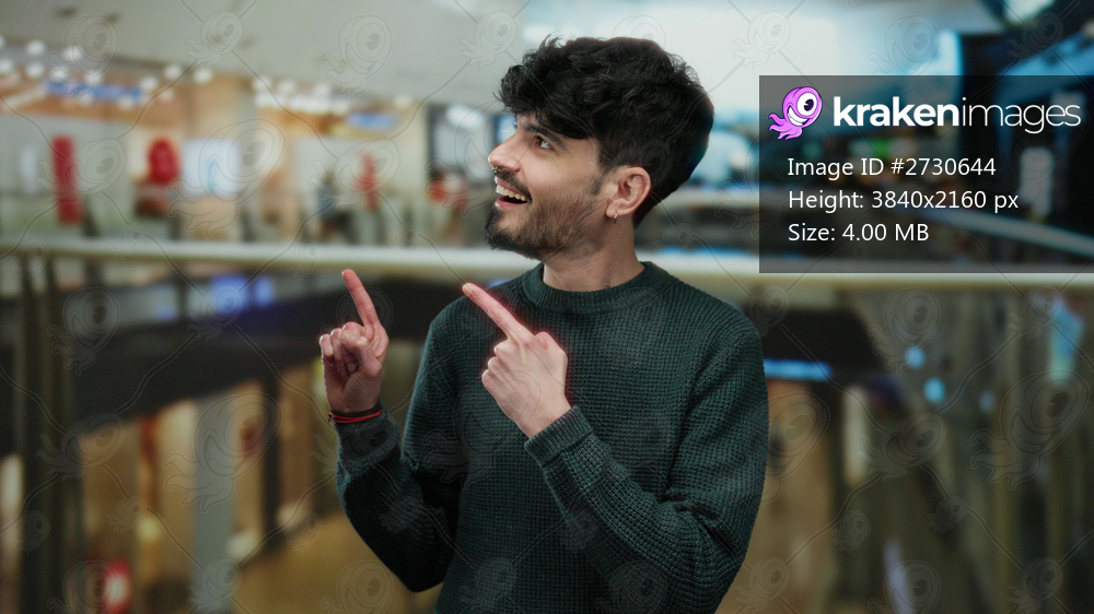 Young man pointing indoors at a bustling mall showcasing vibrant shopping ambiance and expressions of surprise and curiosity.