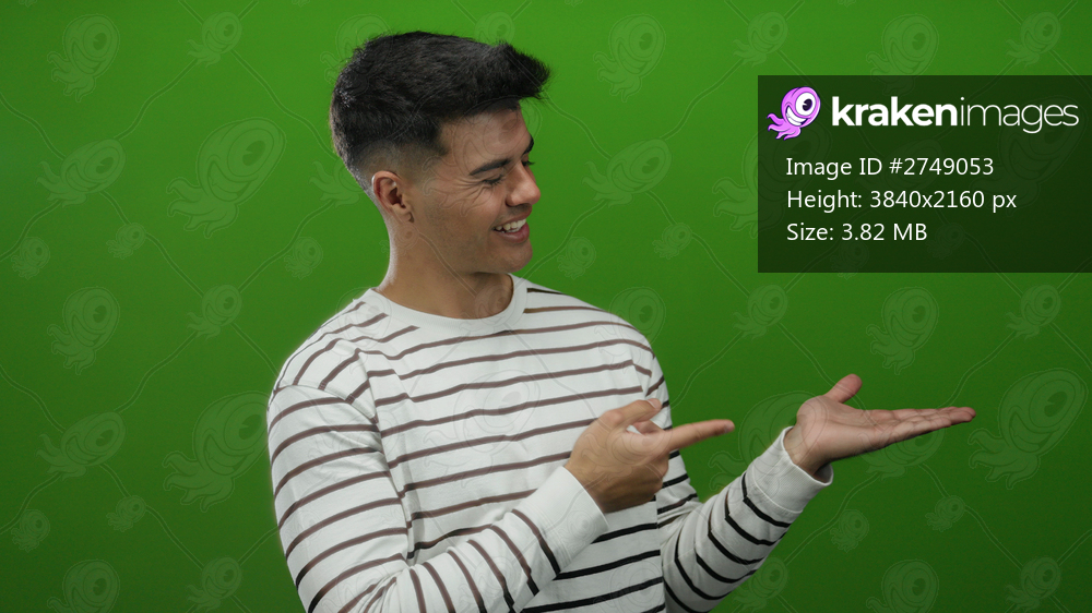 Young man pointing playfully with a winking expression against an isolated vibrant green background in a casual striped sweater.