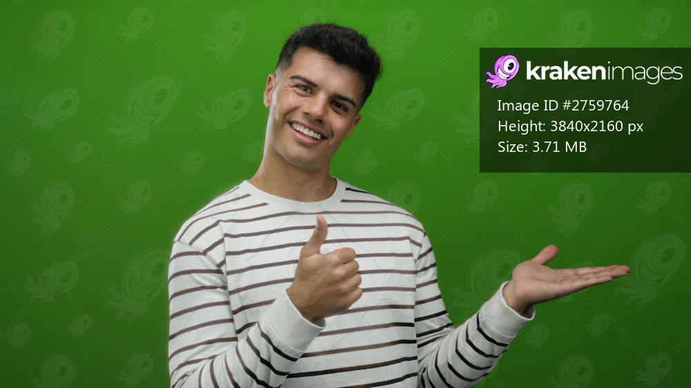 Young man pointing playfully with a winking expression against an isolated vibrant green background in a casual striped sweater.
