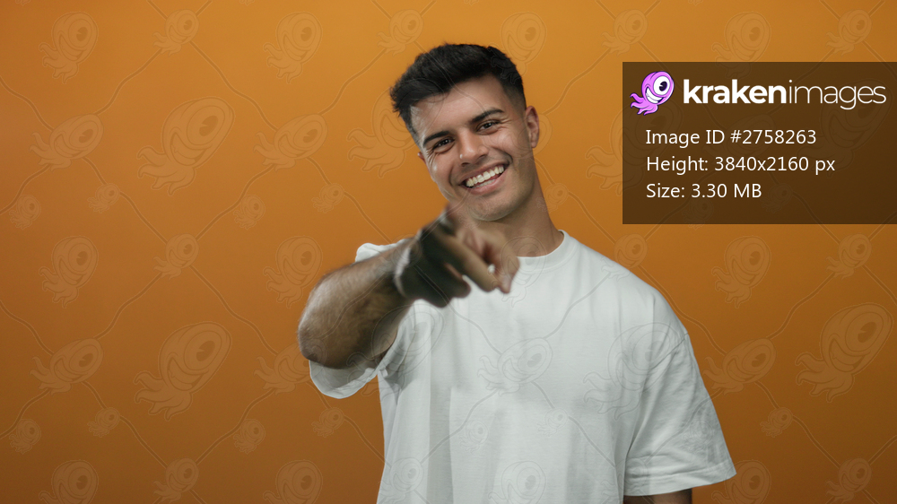 Young man pointing and smiling confidently against an orange background wearing a white shirt conveying positivity and approachability.