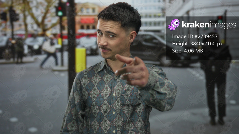 Young man pointing and smiling confidently on a busy city street, surrounded by urban hustle, capturing a vibrant and dynamic outdoor scene.
