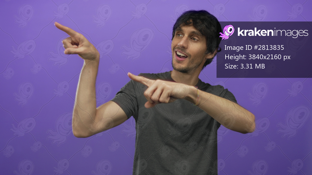 Young man points finger with both arms outward in bright purple studio; enthusiasm curiosity direction discovery.