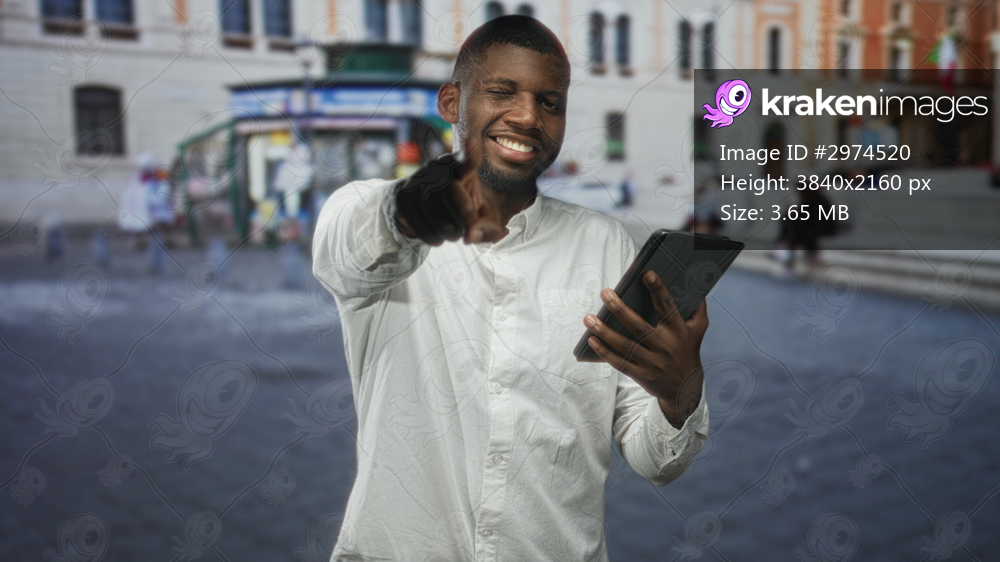 Young man points finger to camera while holding tablet and smiling in street near a kiosk and stone steps; confidence connection.