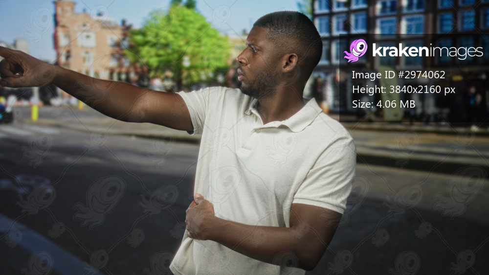 Young man points with outstretched arm while clutching stomach and showing stomachache on a busy urban street lined with buildings and cafes; concern urgency. - Kraken Images