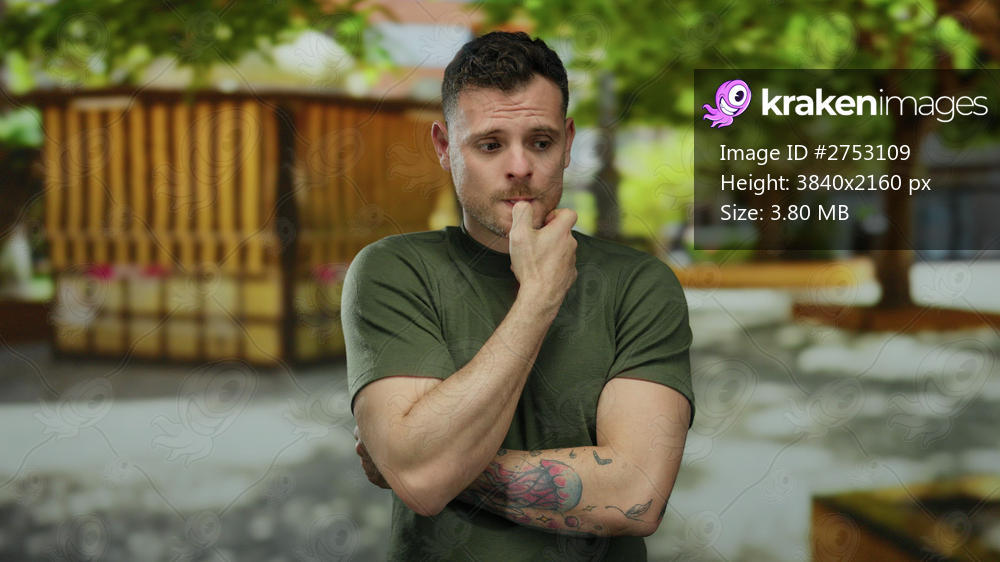 Young man pondering on city street with thoughtful expression under tree shade showing tattoos and casual style suggesting urban lifestyle scene during day. - Kraken Images