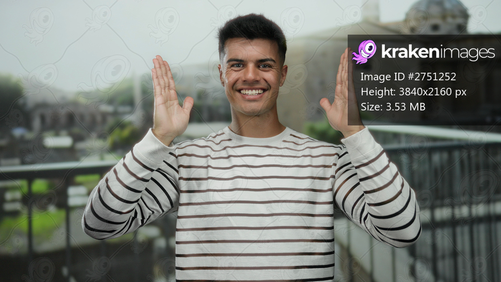 Young man posing with framing gesture in front of roman ruins, smiling outdoors during the day, wearing a striped sweater, showcasing vibrant and attractive energy in an urban setting. - Kraken Images
