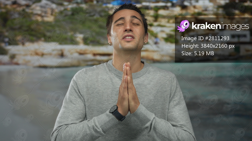 Young man praying at seaside with serene expression, eyes closed, wearing gray sweater, closeup shot, peaceful beach background, hinting at summer vibes, outdoors setting.