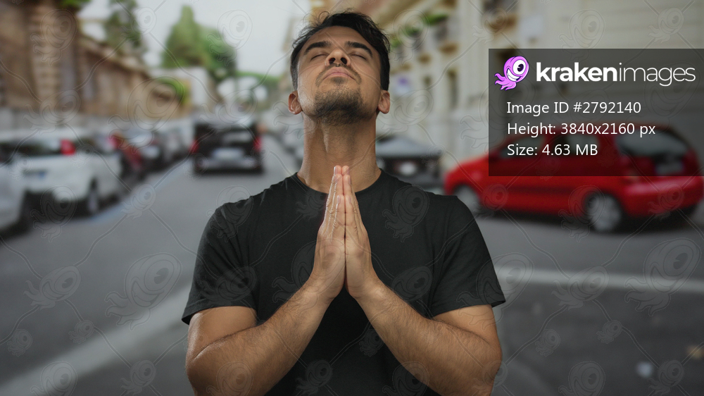 Young man praying outdoors on a bustling city street exuding tranquility amid urban cars and energy.