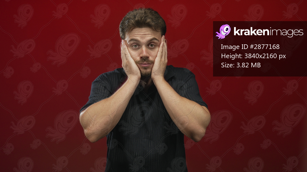 Young man pressing both hands to cheeks with mouth open and raised eyebrows in red studio wearing a dark shirt and facing camera; surprise.