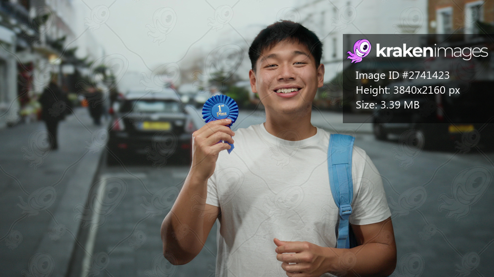 Young man proudly displaying a blue ribbon on a city street, embodying a joyful student vibe outdoors.