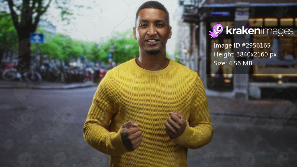 Young man pumping fists on city street, yellow sweater and bare hands visible, smiling and looking relieved; victory joy.