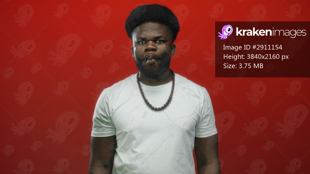 Young man purses lips wearing beaded necklace and white t shirt in studio against a deep red wall with neutral pose; playful.