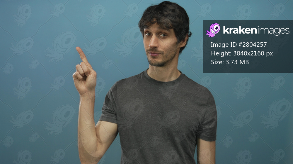 Young man with raised index finger pointing gesture and closed eyes in blue studio with slight smile; contemplation.