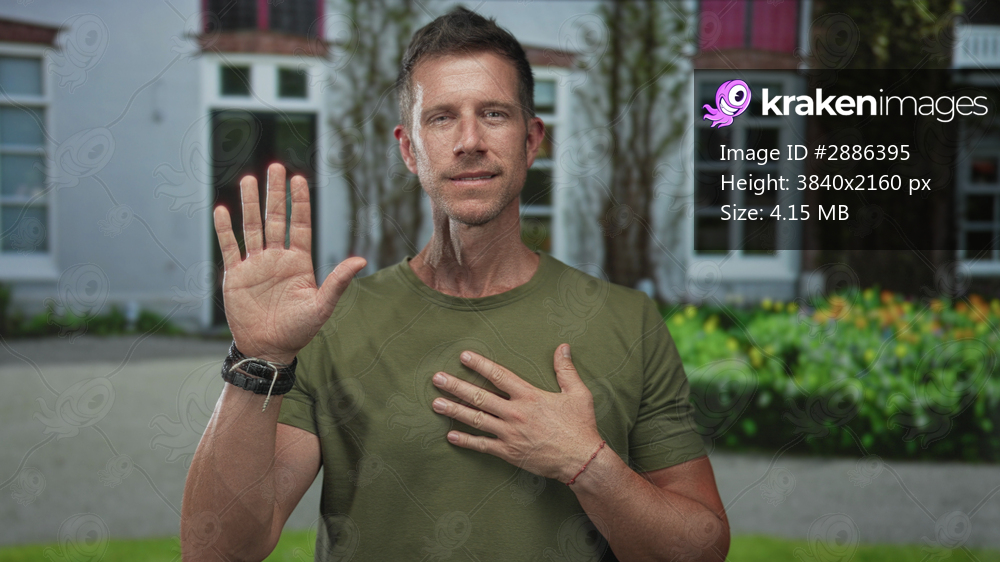 Young man with raised left hand palm out and right hand on chest at residential building entrance outdoors; sincerity.