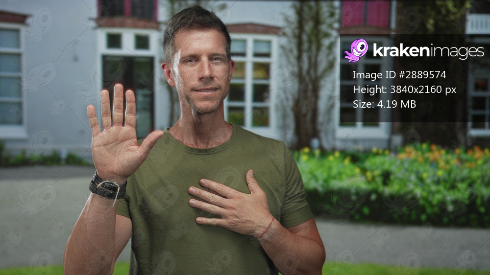 Young man with raised left hand palm out and right hand on chest at residential building entrance outdoors; sincerity.
