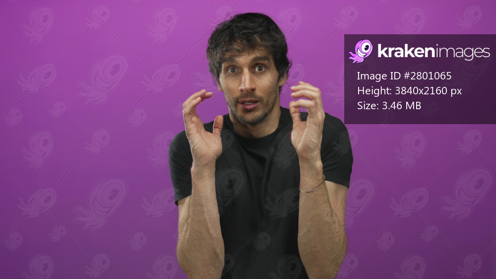 Young man raising hands defensively in studio with purple wall and tense expression and hunched posture; anxiety.