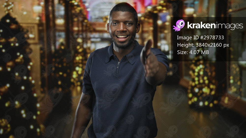 Young man reaches out hand for handshake, smiling in a festive decorated building corridor with christmas lights and trees; friendly welcome.