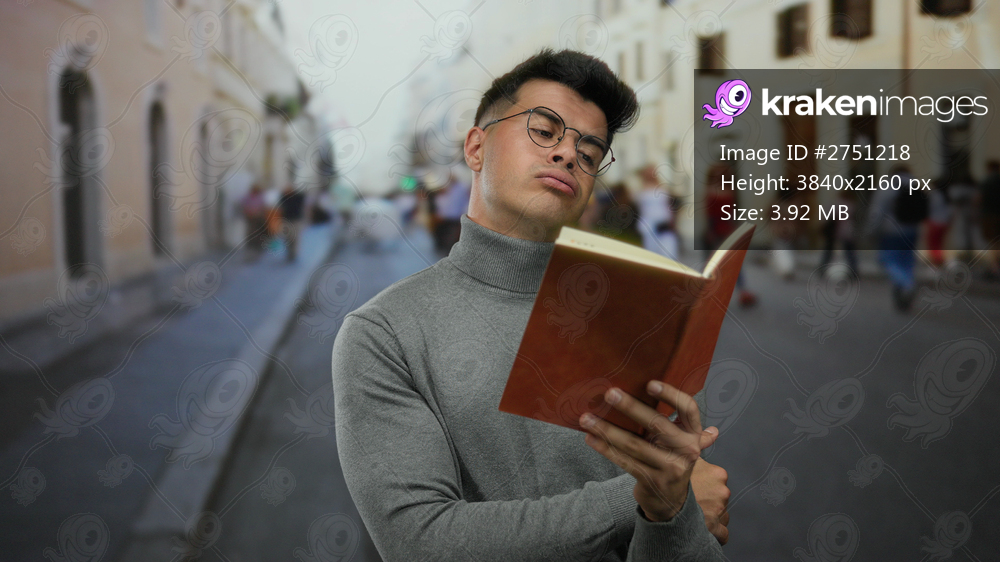Young man reading a book standing on a busy city street with blurred people in the background in an outdoor setting, focusing intently on the pages
