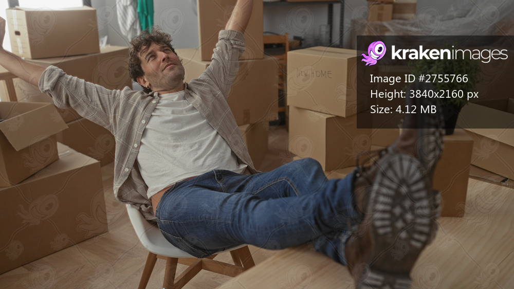 Young man relaxing amidst moving boxes in new home with casual attire and happy demeanor, enjoying the fresh start in modern household.