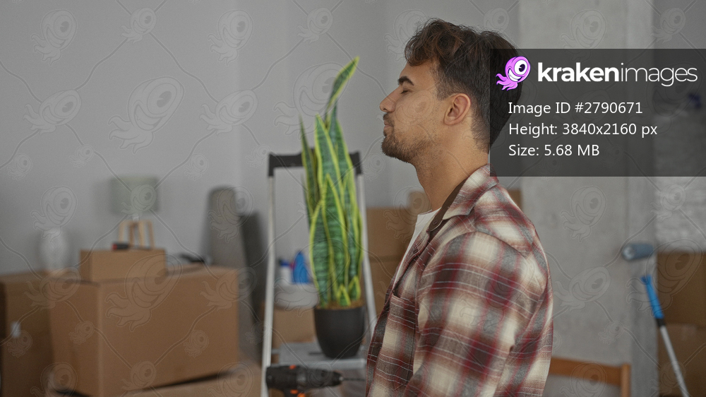 Young man relaxing in new home filled with boxes, plant, and ladder, symbolizing the start of a new chapter and the excitement of moving to a fresh living space. - Kraken Images