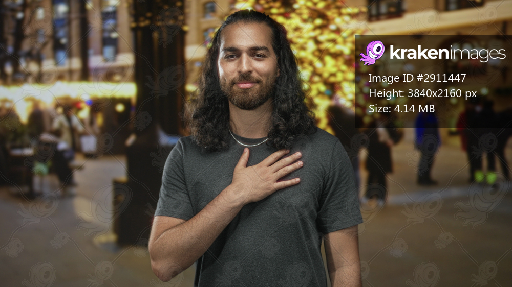 Young man with right hand on chest on street in front of lit holiday tree and blurred shoppers, short necklace visible, wearing grey tee; gratitude.