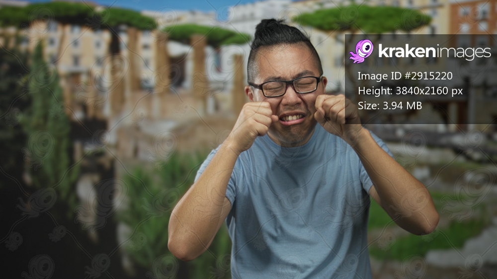 Young man rubbing eyes with fists at roman ruins building under bright daylight, glasses on and hair in topknot; sadness.