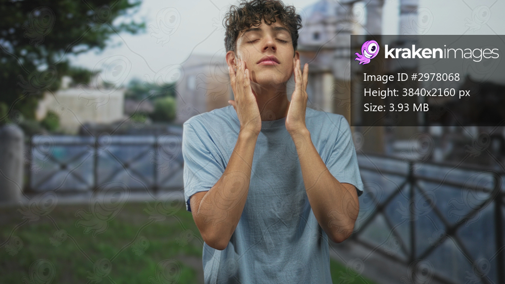 Young man rubbing hands over face near stone building, closed eyes and relaxed posture; quiet contemplation.