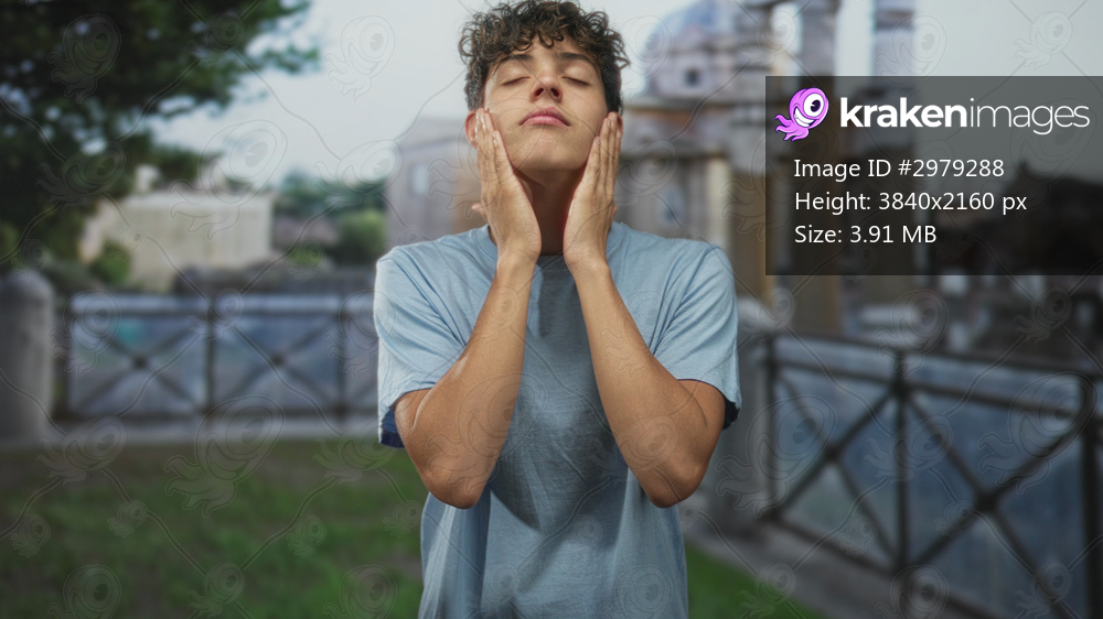 Young man rubbing hands over face near stone building, closed eyes and relaxed posture; quiet contemplation.