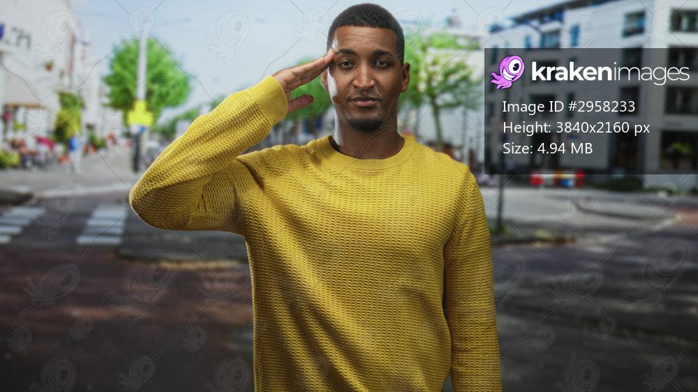 Young man salutes with right hand to forehead on a street by apartment building, wearing yellow sweater and facing camera in mid distance; respect.