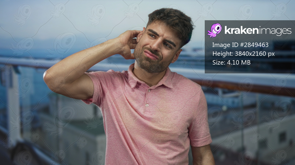 Young man scratches neck against metal railing of cruise boat on building deck under clear sky; unease.