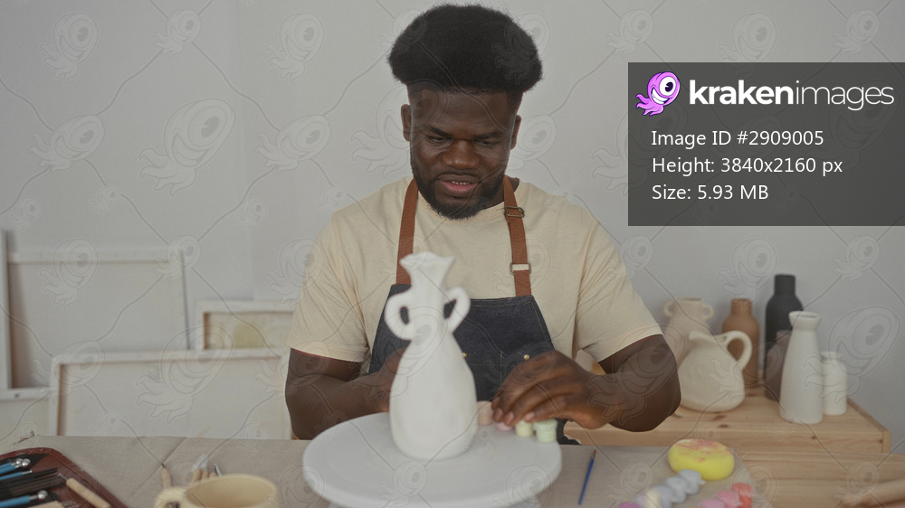 Young man shaping white ceramic vase with hands at pottery wheel in studio wearing apron and surrounded by jugs and pottery tools; craft focus.