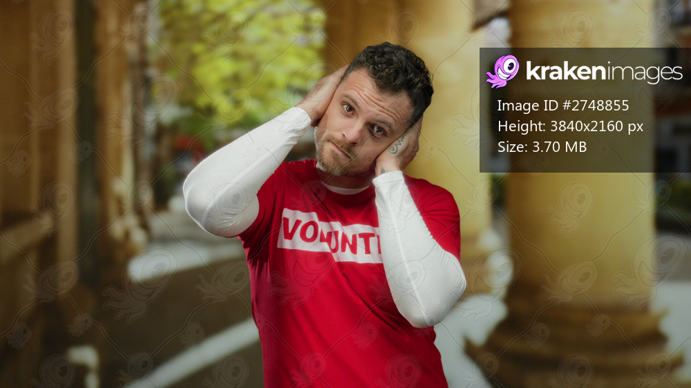 Young man with short hair wearing a red volunteer shirt covering his ears on a sunny urban street with stone columns and greenery in the background.