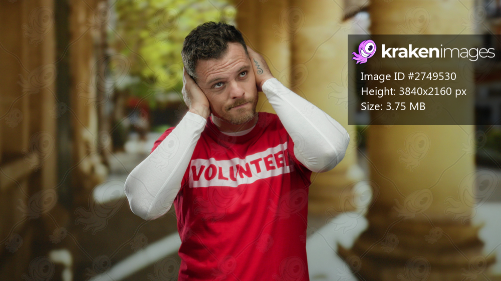 Young man with short hair wearing a red volunteer shirt covering his ears on a sunny urban street with stone columns and greenery in the background.