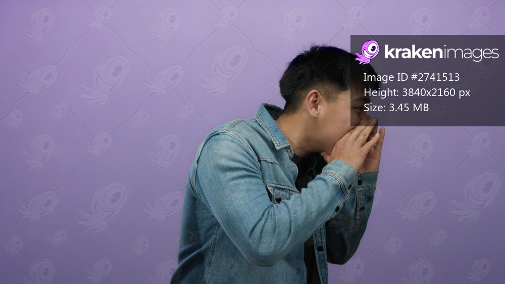 Young man shouting against an isolated purple background wall, expressing emotion and energy in casual denim outfit, conveying communication and vibrancy. - Kraken Images