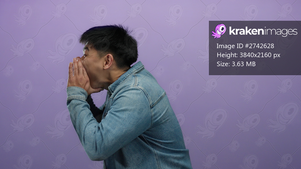 Young man shouting against an isolated purple background wall, expressing emotion and energy in casual denim outfit, conveying communication and vibrancy. - Kraken Images
