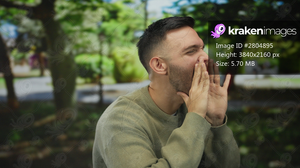 Young man shouting outdoors in a green park setting, surrounded by vibrant nature and trees, expressing excitement with a dynamic and lively facial expression. - Kraken Images