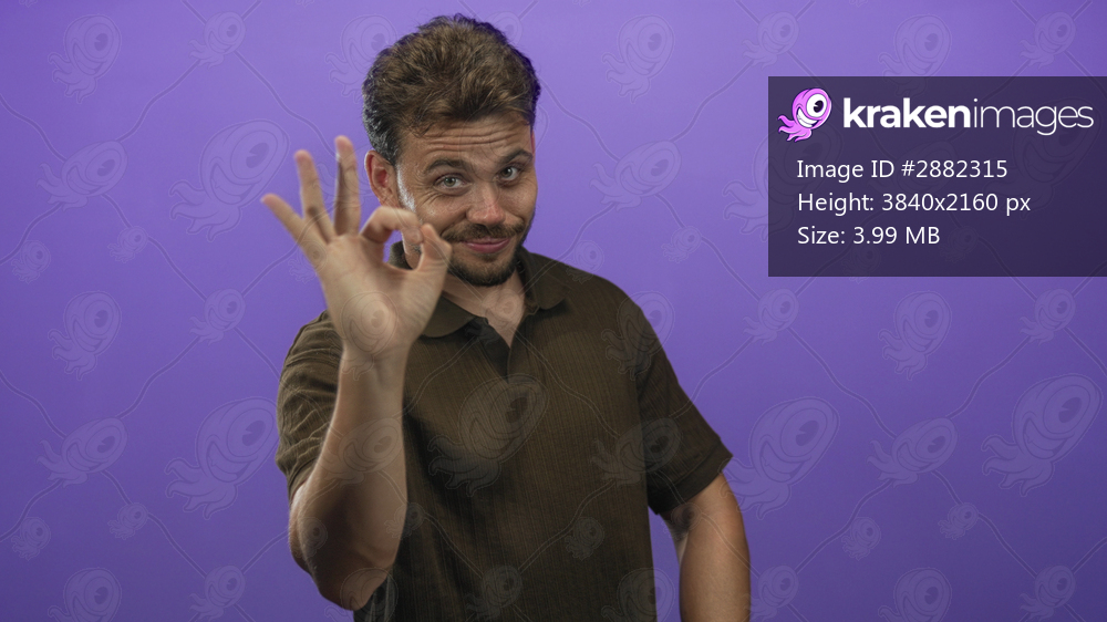 Young man showing ok hand gesture in purple studio setting, casual brown polo shirt visible; approval.