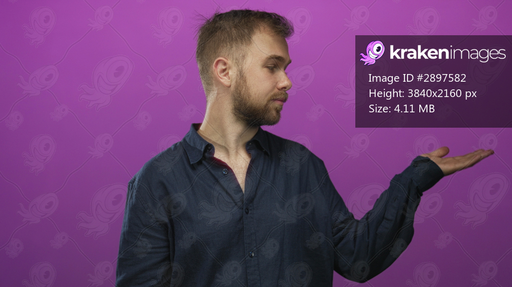 Young man showing open palm and raised hand gesture as if presenting an object in a studio with purple backdrop; skepticism.