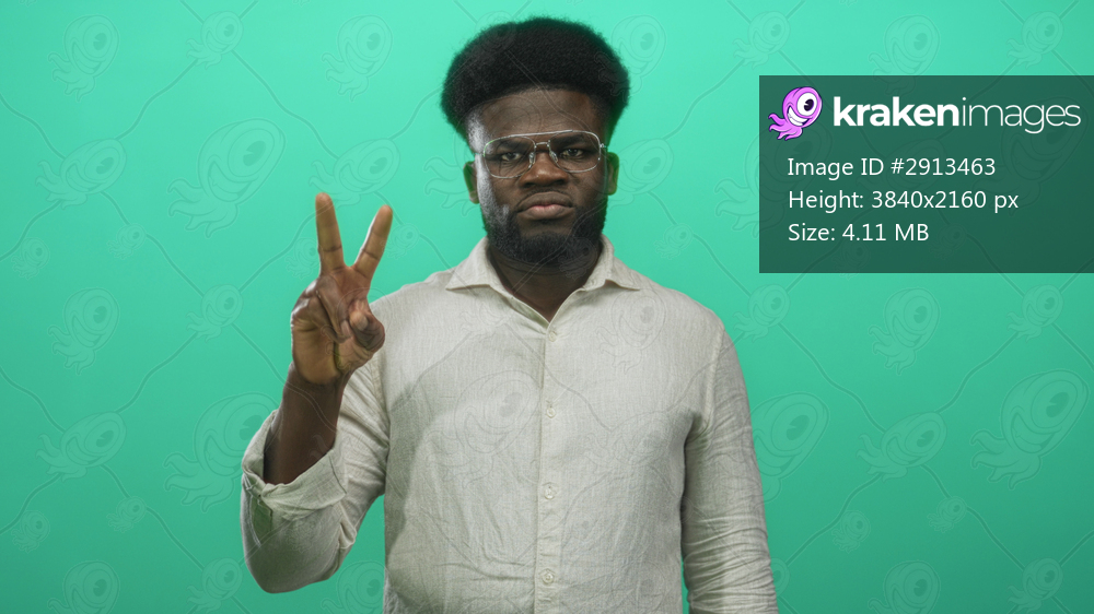 Young man showing peace sign with hand in studio wearing glasses and linen shirt; confidence optimism.