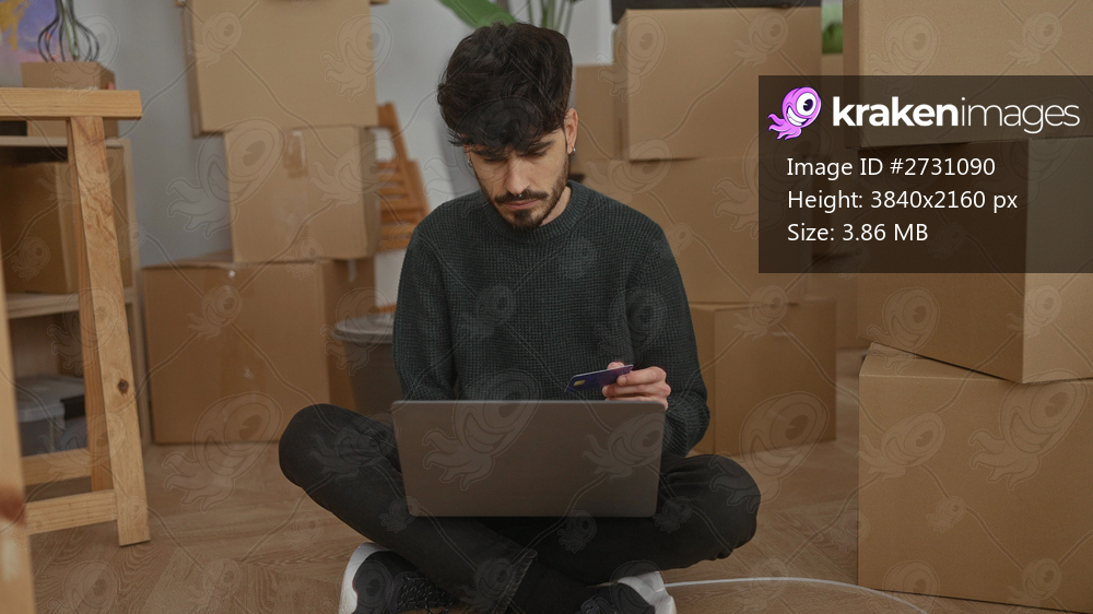 Young man sitting in living room of new home surrounded by cardboard boxes holding a credit card and using a laptop for online shopping.