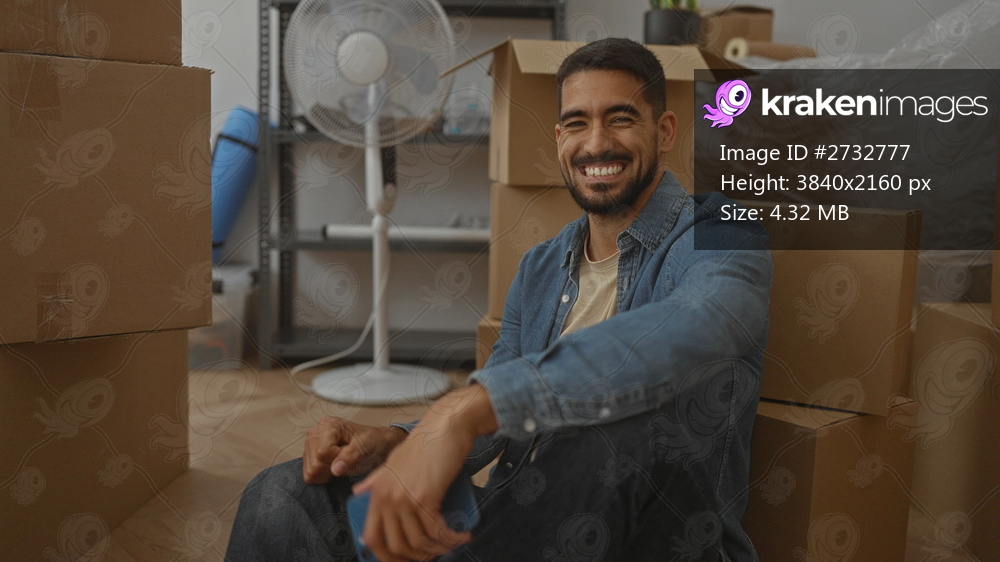 Young man sitting in new home surrounded by boxes, smiling while using phone in spacious living room with unpacked items and modern decor.