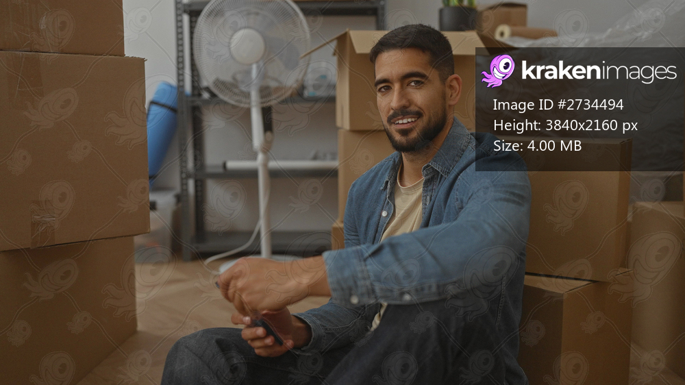 Young man sitting in new home surrounded by boxes, smiling while using phone in spacious living room with unpacked items and modern decor.