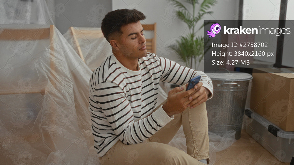 Young man sitting indoors in new home surrounded by moving boxes using smartphone looking thoughtful and relaxed