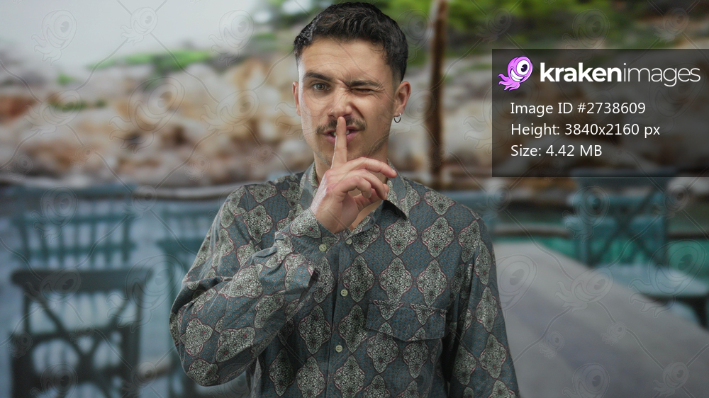 Young man sitting outside at a terrace cafe gestures for silence with a finger to lips, set against a backdrop of blurred outdoor seating and nature.