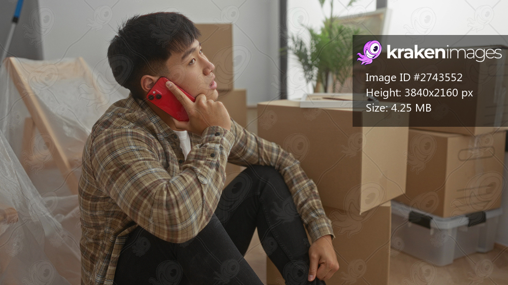 Young man sitting with phone surrounded by moving boxes in a new apartment living room, captured in thoughtful expression, suggesting relocation or settling into a new home. - Kraken Images