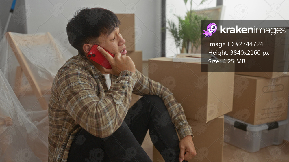 Young man sitting with phone surrounded by moving boxes in a new apartment living room, captured in thoughtful expression, suggesting relocation or settling into a new home. - Kraken Images