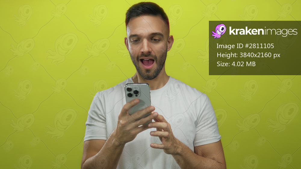 Young man with smartphone in hand looks surprised against bright yellow background, captivated by something on screen.